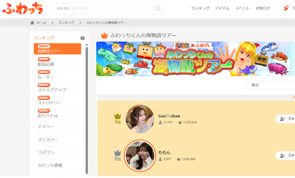 ふわっちは、毎日、毎月で結果発表されるランキングがあります。